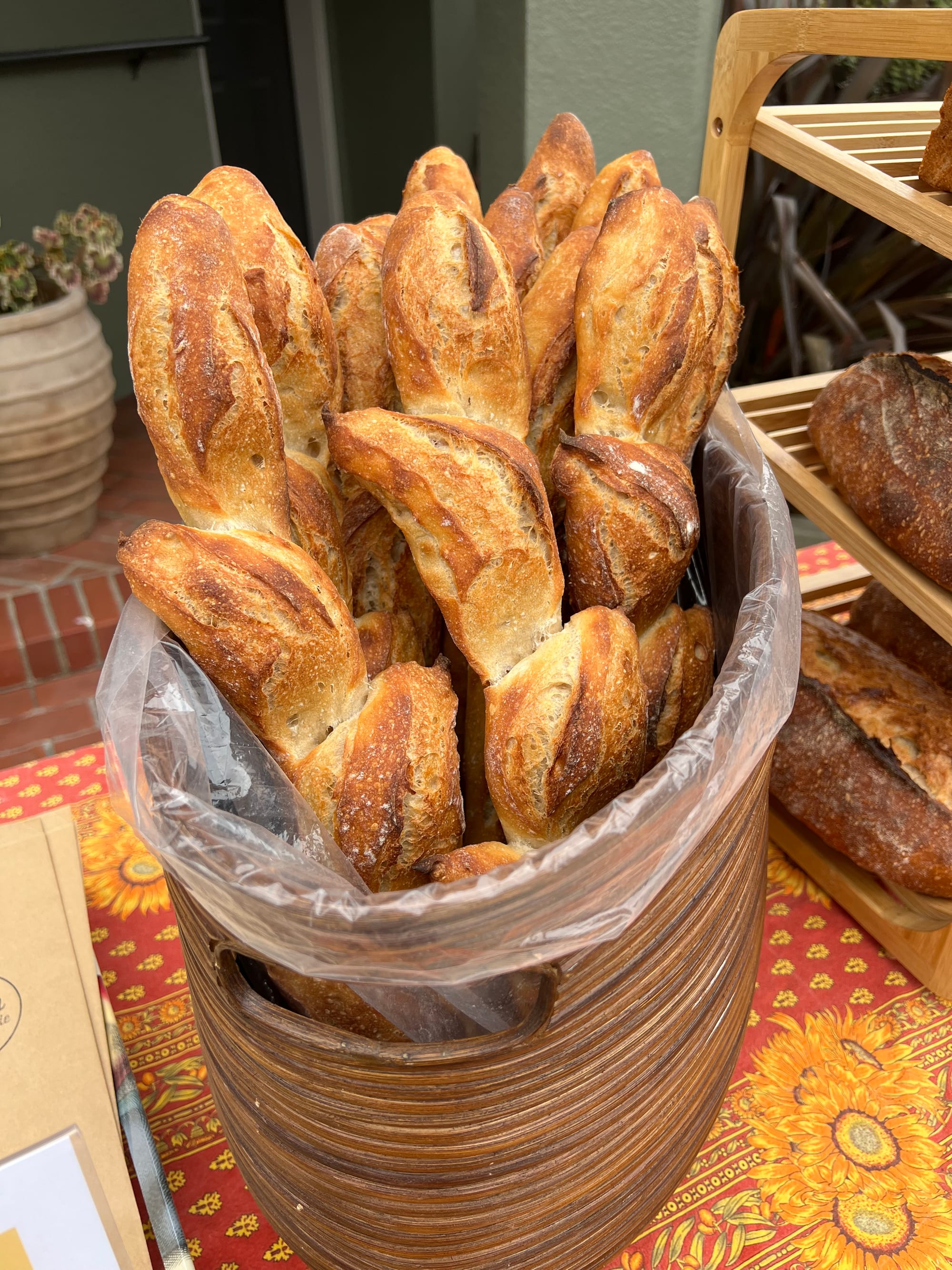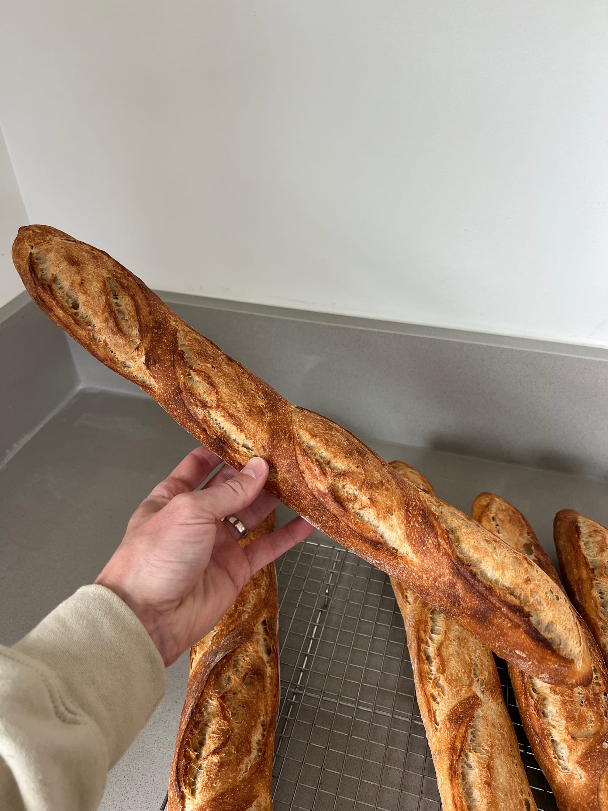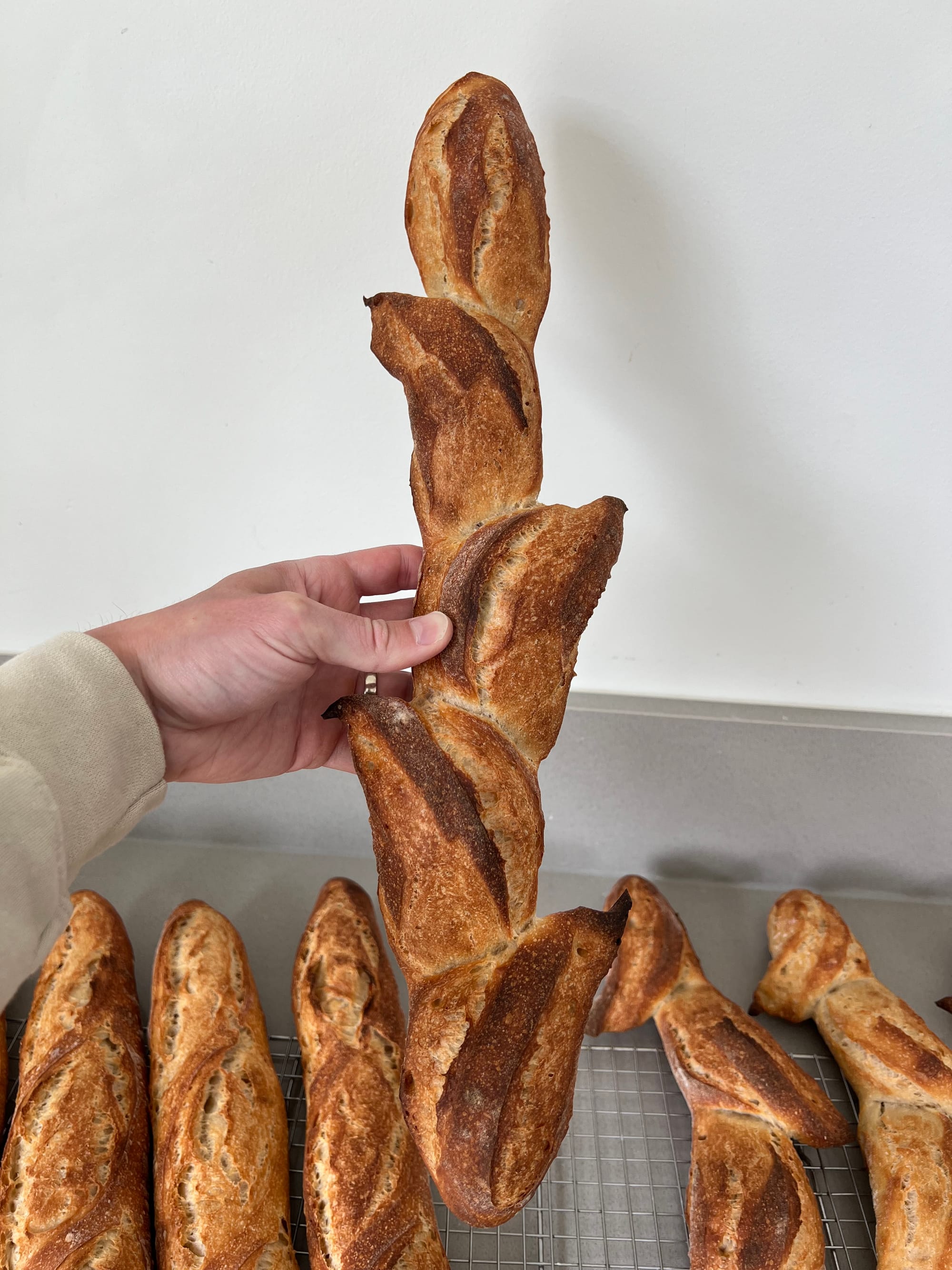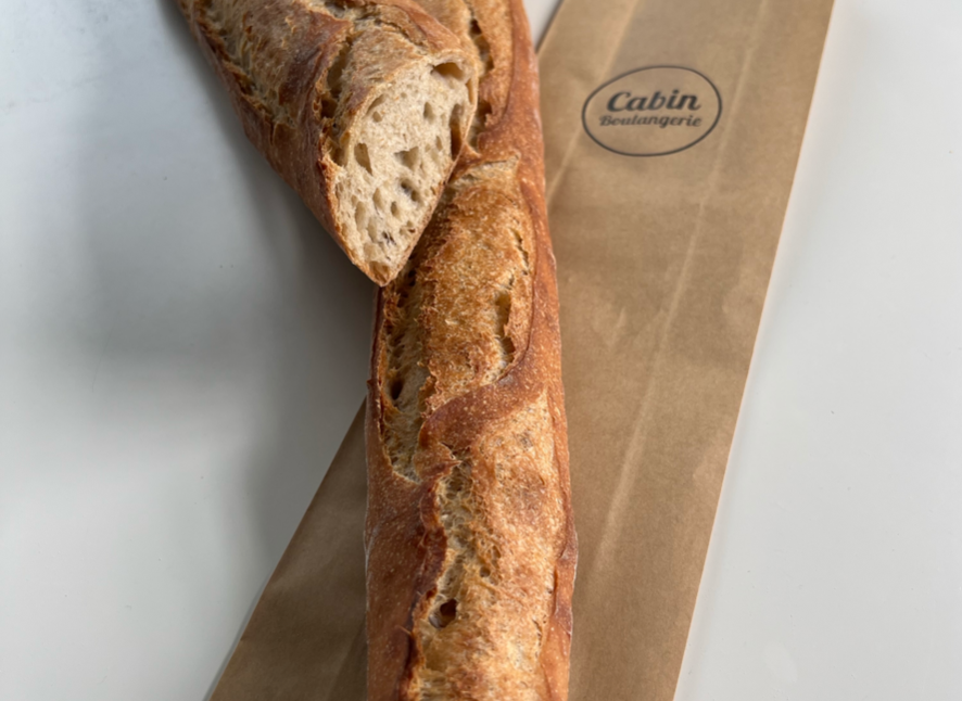 Artisanal Sourdough Baguette made with Organic Wheat flour and Organic Whole Wheat flour.